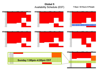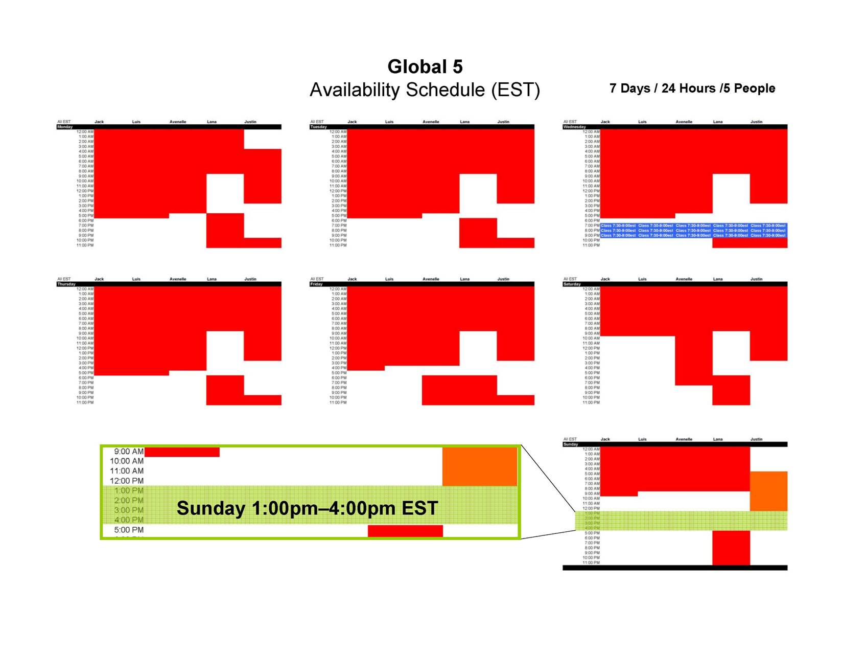 By design, group projects pose an inherent challenge to the distance learner; we are at the mercy of web-based technology for all form of communication, collaboration and shared information. Our group was comprised of Jack Bosley, Luis Tazoe, Lana Dabboussy, Avanelle Joseph Edwards and myself. We were five students, native to four languages, living in three countries, stretched over multiple time-zones – spanning a 10 hour difference. Add to that an electricity crisis and political upheaval in one of these locations, the random infant crying in the background at a few others, and a seemingly unsolvable scheduling conflict (see graphic) and you have the makings of what we appropriately named our group, Global 5.